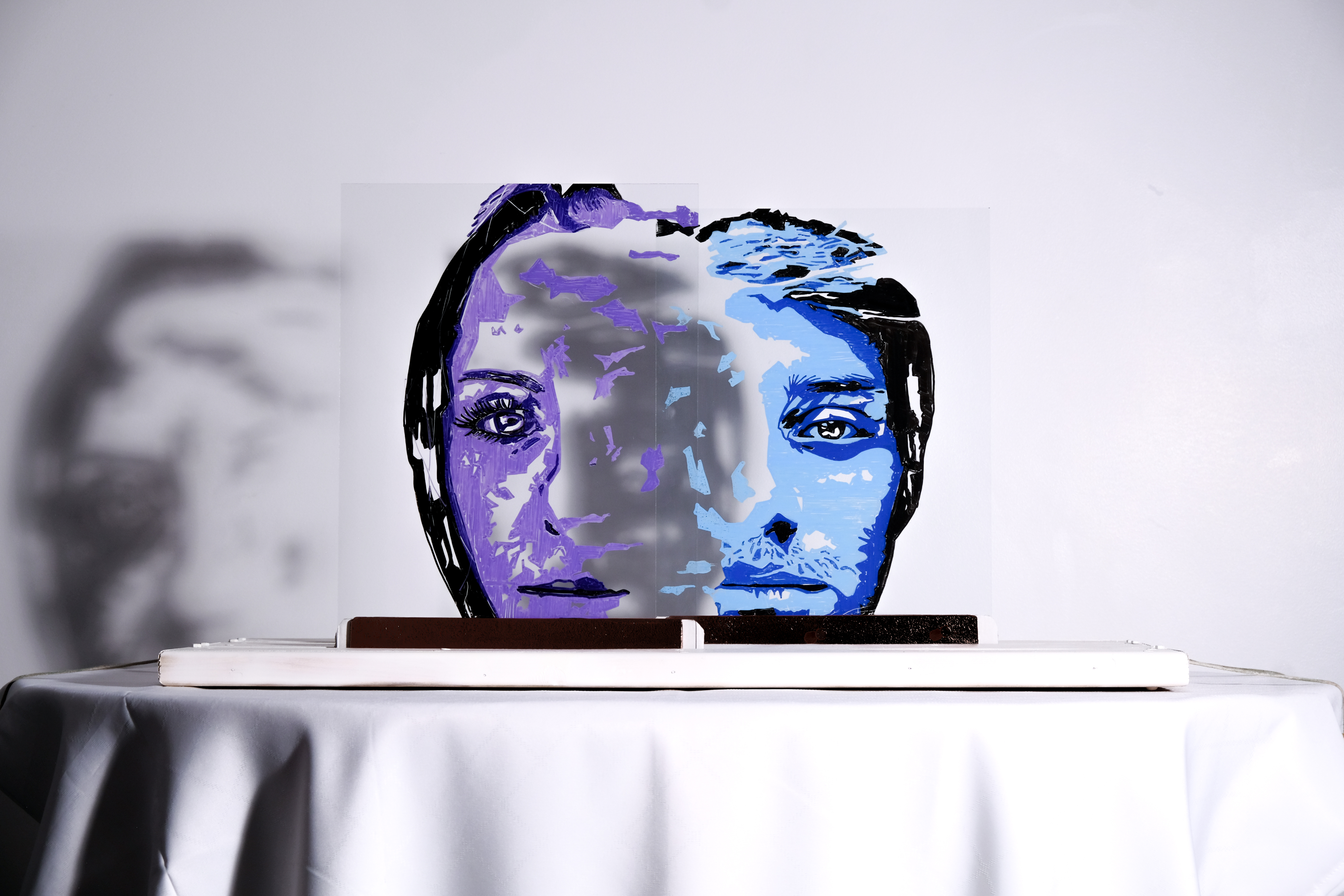 J’ai exploré la transparence du verre et la superposition de deux visages, un homme et une femme dessinés sur des plaques en verre mobile. Le déplacement de ces plaques modifie la composition et crée plusieurs lectures possibles : la fusion, l’union ou la séparation. Ce jeu visuel et lumineux symbolise la fragilité et la beauté changeante du sentiment amoureux.
